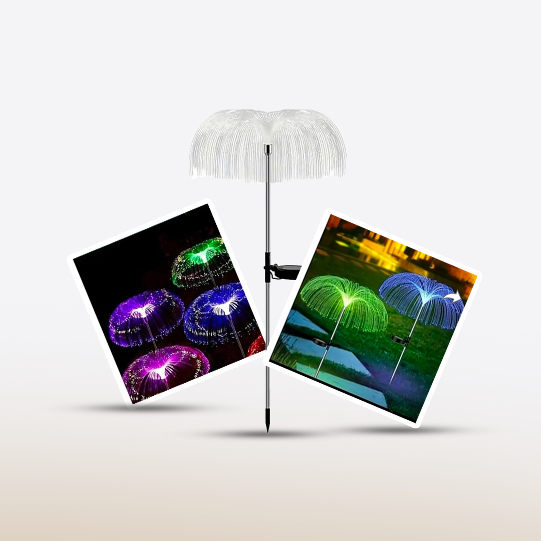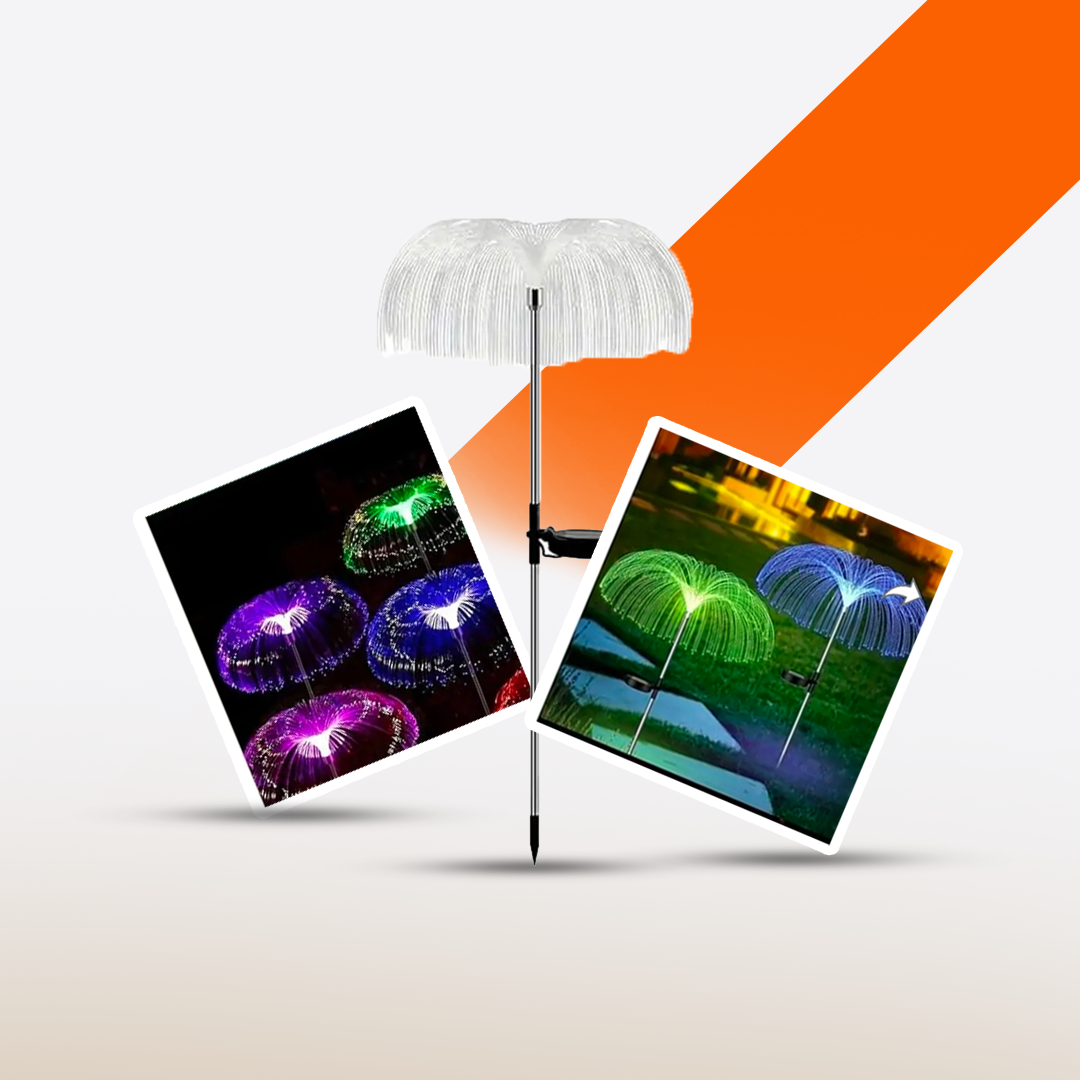 Solar Jelly Fish Light is a decorative, solar-powered outdoor light designed to resemble a glowing jellyfish, perfect for gardens, patios, and pathways.
