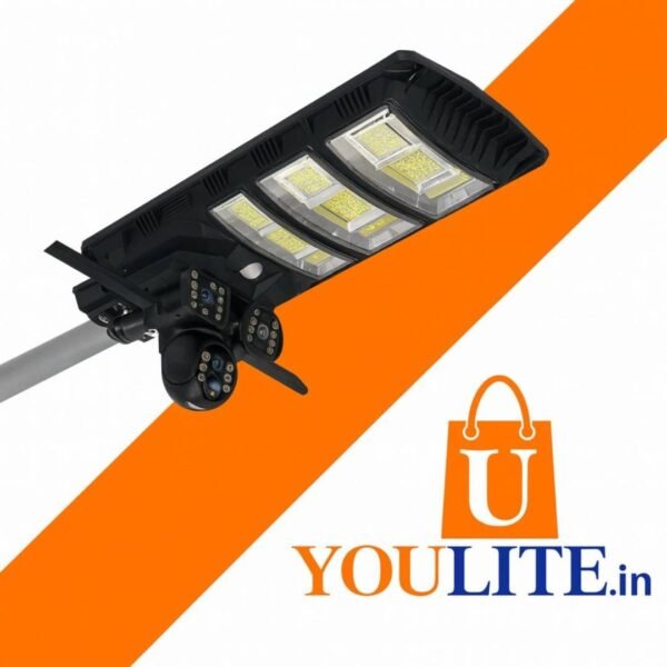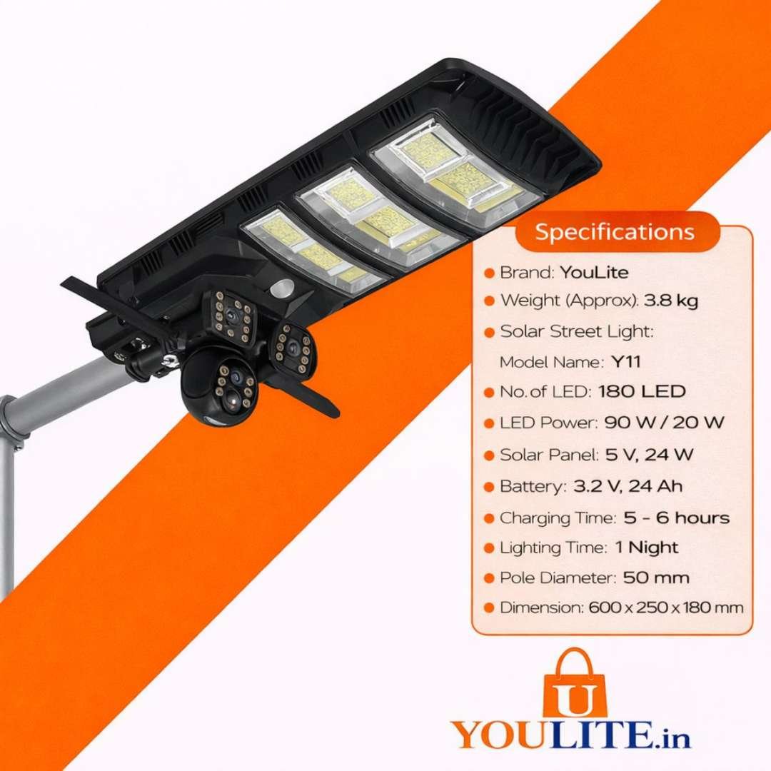“Solar Street Light features 180 LEDs with 90W LED power and 20W output, delivering bright cool white illumination. It comes with a 5V 24W solar panel and a 3.2V 24Ah battery, offering 5–6 hours charging and full night backup. Suitable for 50mm pole, size 600×250×180 mm.